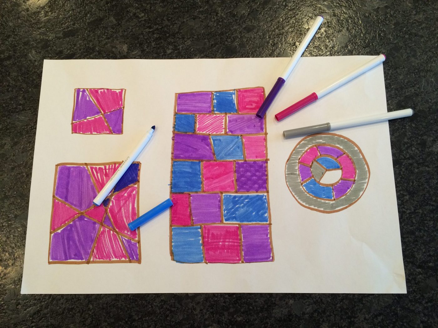 (Mathematically…the act of stepping through the logical possibilities while trying to color these patterns will help develop critical thinking skills. This activity is based on the Four Color Theorem, which states that any map can be colored with just 4 colors following the rule that no two spaces sharing a border may be the same color. A more official statement of theorem is given any separation of a plane into contiguous regions, producing a figure called a map, no more than four colors are required to color the regions of the map so that no two adjacent regions have the same color. Whew. Theorems in math must be proved, and this one’s proof was elusive for a long time. The theorem was first stated in 1852, but it wasn’t proved until 1976. Efforts to find a proof led to the development of Graph Theory. Did you learn that in school? I didn’t. But I’m pretty sure I would have enjoyed coloring as a gateway into deeper mathematical topics. I only first heard of the Four Color Theorem and this activity from another mathy mom. Her blog, Musings of a Mathematical Mom, is another source of inspiration, and I highly recommend it.)