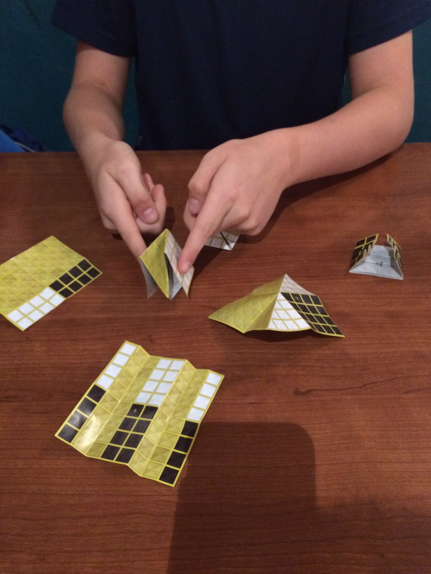 So, I solved the folding puzzle myself. It was easy because it was the very first one. The puzzles increase in difficulty. The goal is to fold the paper in such way that the 8×8 grid becomes a 4×4 grid with only black boxes on one side and white boxes on the other. After I solved the first puzzle, I unfolded it and put it to the side while I ripped off the next puzzle to give it a go. At first, I felt like I was wasting something that I had bought for my sons, but then I realized that they were benefiting from watching me get absorbed in figuring out the increasingly difficult solutions, AND as they started to fiddle around with my solved puzzles, there were learning the possibilities. (It’s important to remember that I hand them things like this when they are otherwise bored or unable to walk away from me…most recently we did this on an hour trip on the commuter train. What else are they gonna do?) I keep all the “solved” puzzles in the box with the ones we haven’t tried yet. When I take the box out, the kids sometimes fiddle with an old puzzle or try a new one. I often help with showing them how to fold precisely.