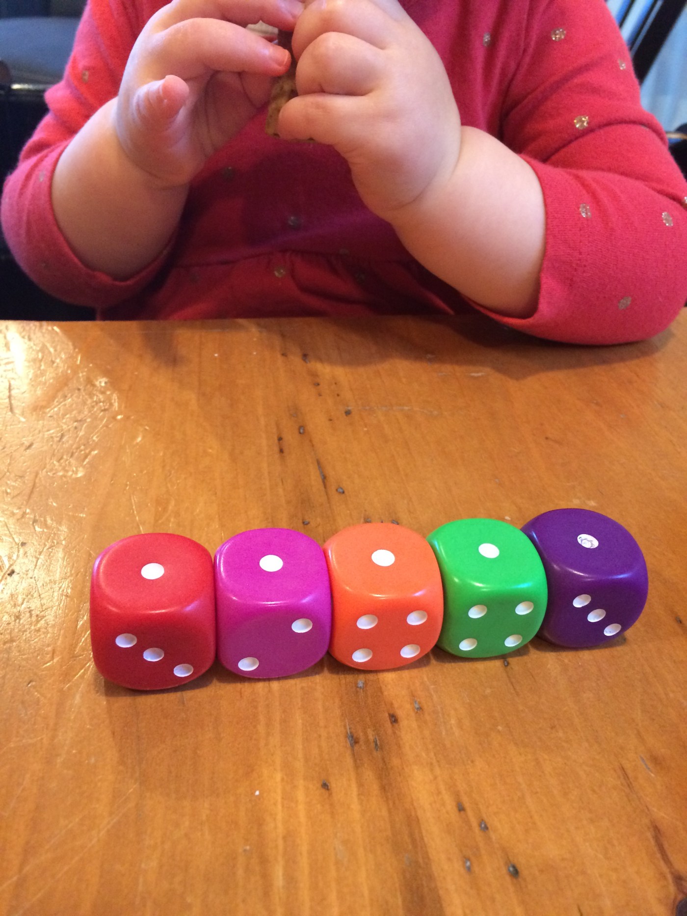She was not put off by this (certainly not as much as I was!) She covered the dice with her hand, shook them on the table, and removed her hand. Then she smiled. We shuffled the dice around a little more, and then she lifted her arms into the air, looked at me, and clearly said, “UP.” So we left the table to find other things to play with.